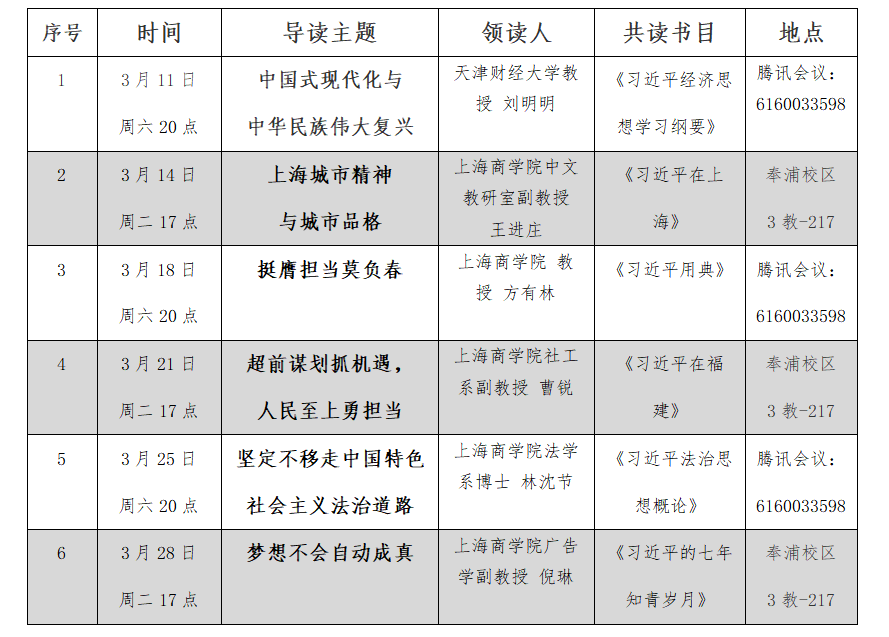 3月份,由文法学院党总支率先推出校园读书活动第一期共6场,主题为“挺膺担当正当时——2023香斋书院共读荟”,活动注重持续引导青年学生“爱读书、读好书、善读书”,同时展示文法学院《习近平法治思想概论》和《习近平成长历程与思想发展》课程建设与教学的阶段性成果。
