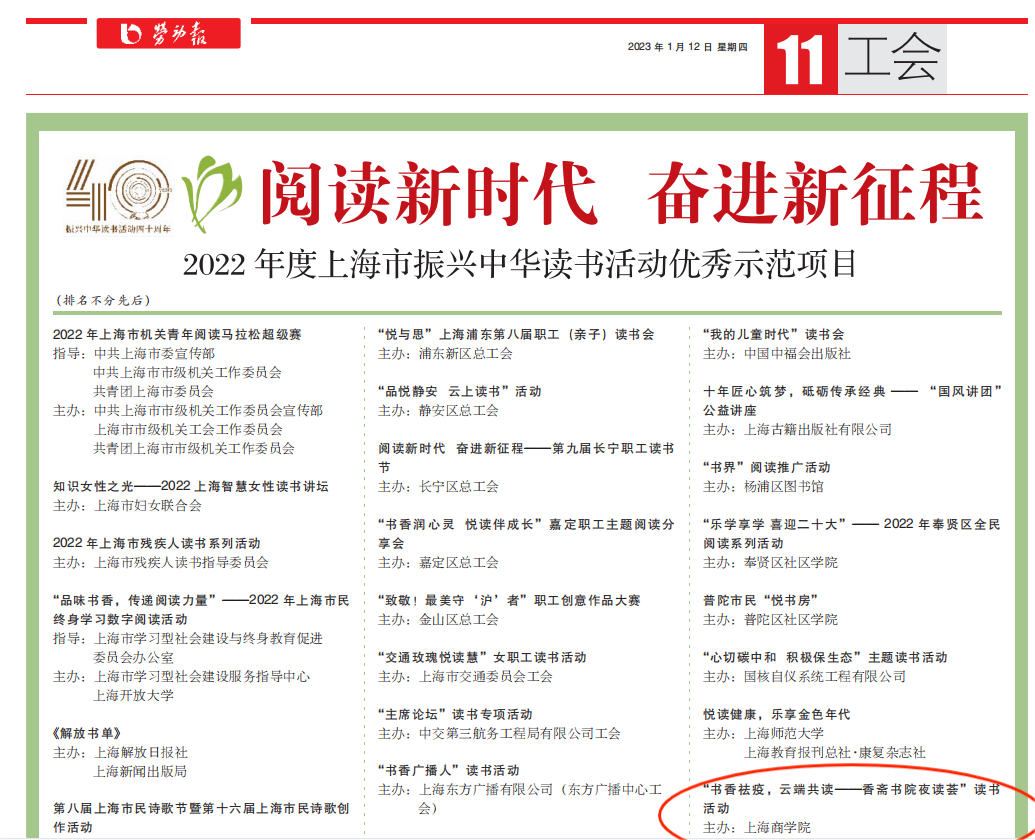 其中,2022年由文法学院领衔的“书香祛疫,云端共读——香斋书院夜读荟” 读书活动,荣获“上海市振兴中华读书活动优秀示范项目”。2022年举办的长三角阅读论坛,在社会上产生广泛而积极的影响,进一步助推书香校园、书香社会建设向纵深迈进。