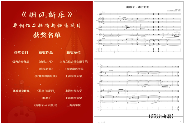 近日,上海市学生民乐联盟公布《国风民乐》原创作品扶持与征集项目获奖名单,我校大学生艺术团民乐团的原创作品《南歌子•水云舒月》获得优秀重奏作品奖。